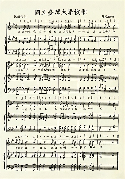 台湾大学校歌为第二任文学院院长沈刚伯教授提出制作的,并将草拟之歌词致呈钱思亮校长,经多次修正,于1963年12月17日行政会议通过后,函请赵元任博士谱曲,1968 年12月5日正式颁布校歌。