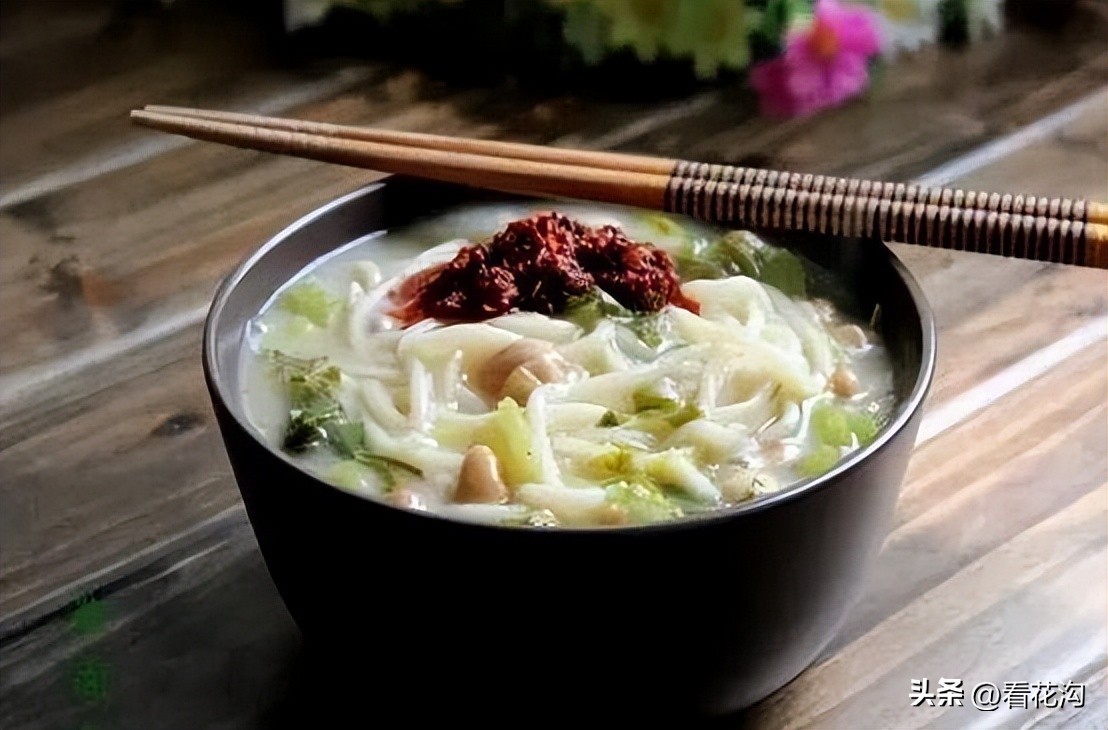 38.灵宝市的美食小吃-灵宝浆饭。灵宝人对浆面条、浆面片的统称。一是所用浆水十分独特,是制作灵宝名吃一生凉粉的副产品,所以又被称为粉浆,这可是做浆面条的基础性环节。先将优质绿豆倒入清水中浸泡4小时左右,待绿豆充分膨胀后,在水磨上磨成粗浆,用纱布过滤去渣,放在盆中或罐里,加入酵面后密封,一两天后浆水发酵变酸,粉浆就做好了。上等的粉浆,色泽白中泛青,浆味酸中带香,醇厚绵长。二是多用筋道的手擀面。将擀好的大圆面片根据个人喜好切成细面条或更短更宽的面片,面片更为筋道,面条则浆味渗透得更彻底,各有特色。三是菜品花色丰富。芹菜丁、海带片、花生仁、鲜黄豆、嫩豆腐等。