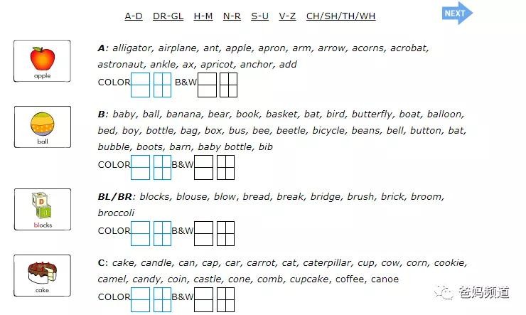 各类卡片都是图片+单词的形式,格式都排好了,A4纸打印下来,直接裁剪就OK, 爱涂色的小娃还能学完继续涂色。