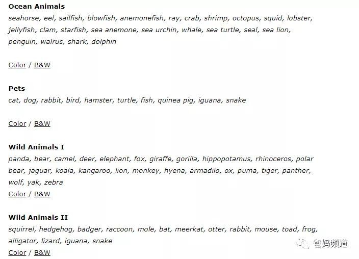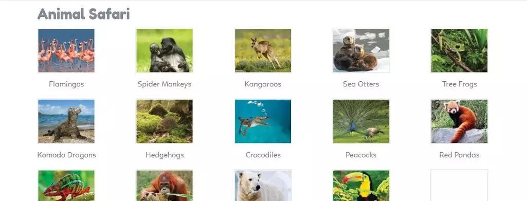 动物卡片,其中这部分还把动物进行了细分,包含了海洋动物,野生动物,农场动物,昆虫,鸟类等。