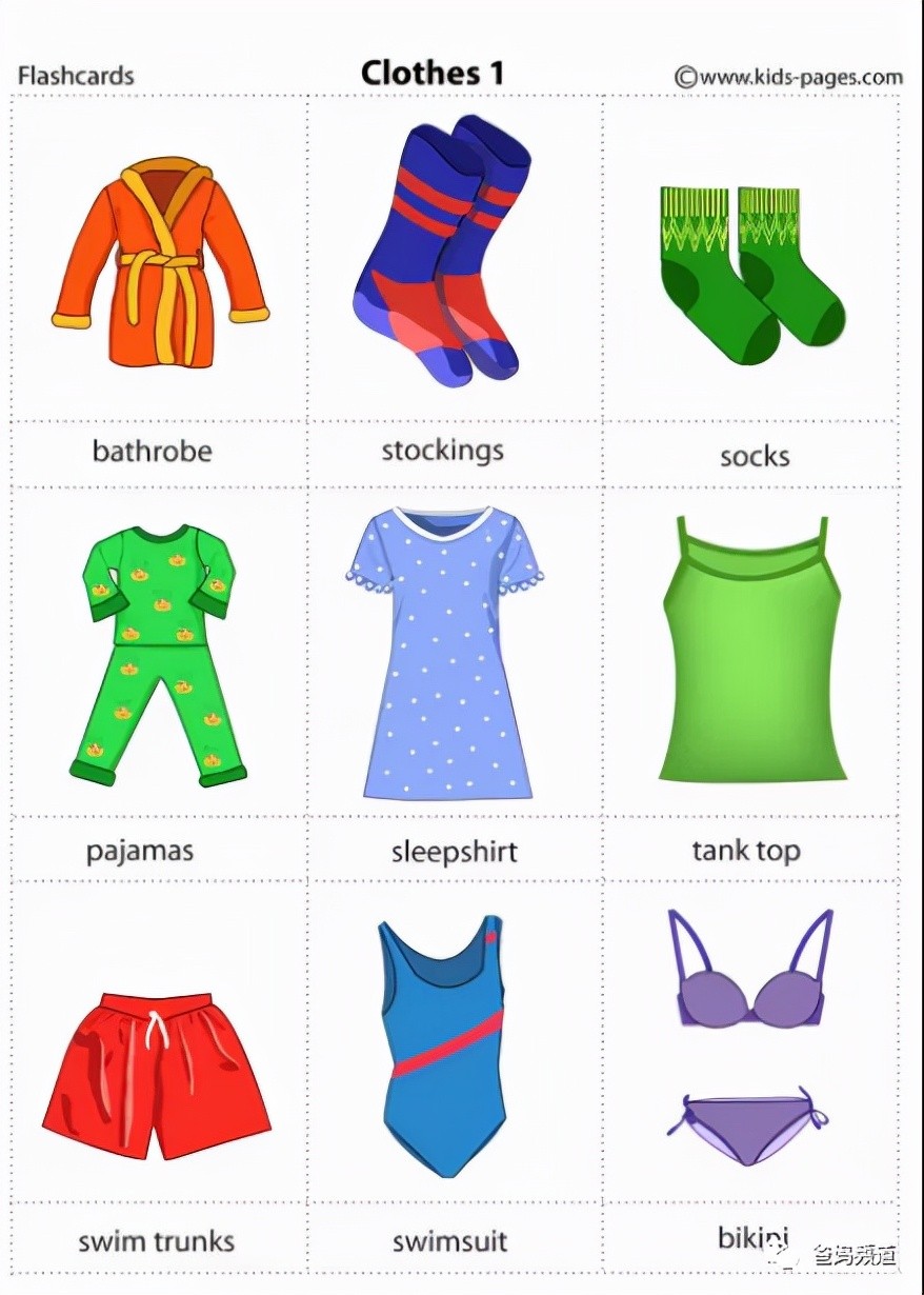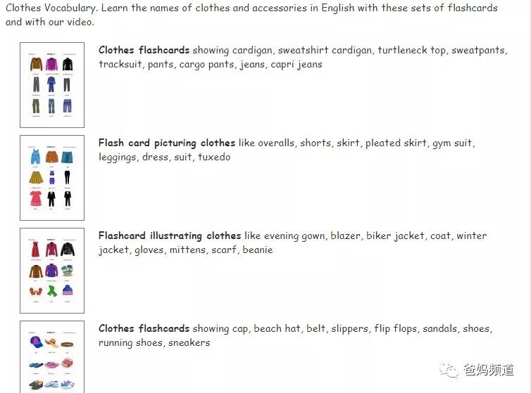 每一个主题的词汇都非常全面,比如下面服装类的词汇,在下载之前,都会有索引,告诉你这张卡片中包含了哪些衣服类的词汇,父母就可以筛选,根据孩子当下的词汇量选择性下载。