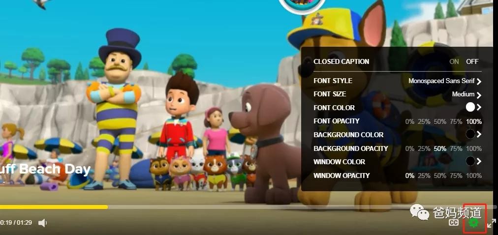 在看的时候可以选择英文字幕,开关CAPTION,字幕的大小和背景色等都可以调节,