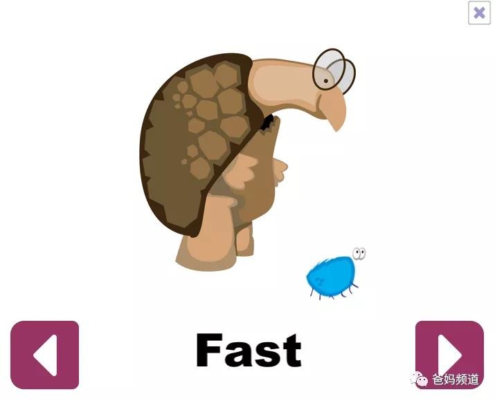比如说第一个主题是Opposites, 那么动画就声音+动作来展示给孩子slow, fast的含义,