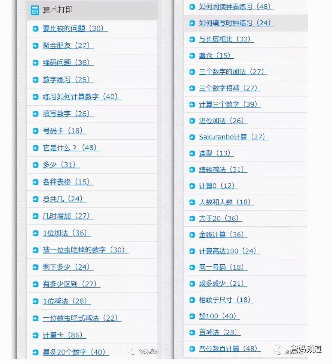 有比较大小,数字,计算,多少,加减,时钟,进位等等, 从学龄前到小学阶段的都有。