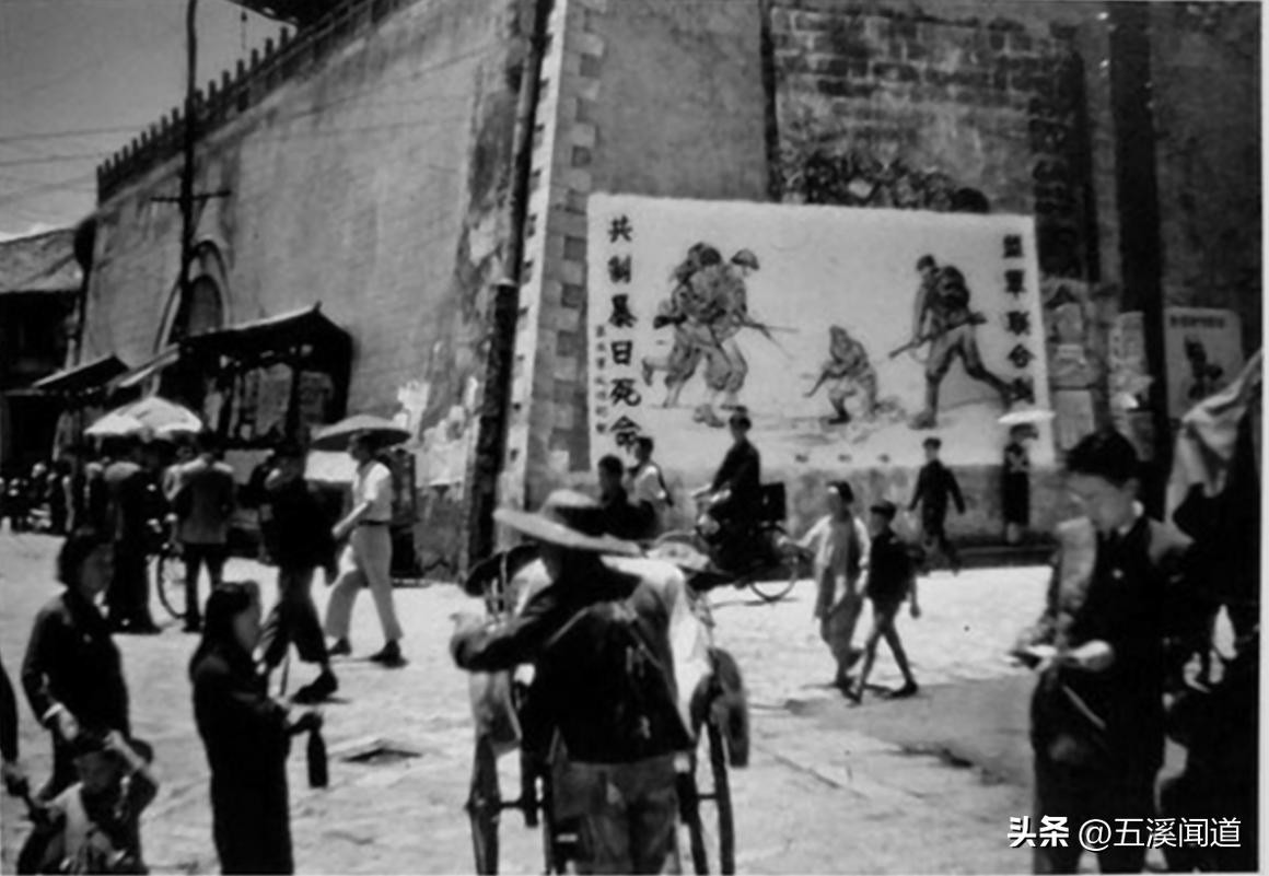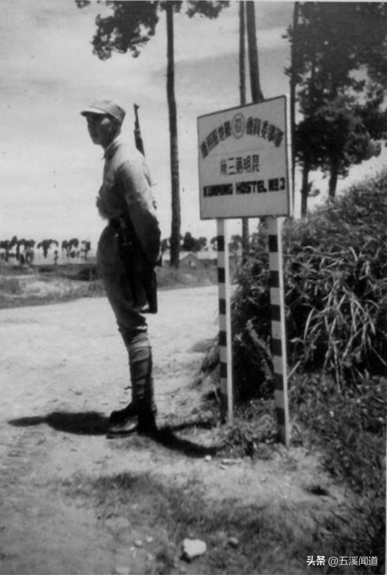 图为昆明路边的站岗的士兵,身后竖立一个指示牌,上写“军事委员会昆明第三所”