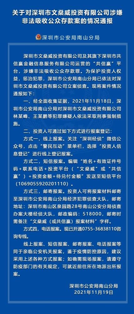据通报,深圳市文威投资有限公司及其旗下深圳市共信赢金融信息服务有限公司运营的“共信赢”平台,涉嫌非法吸收公众存款罪。为保护投资人权益,惩治犯罪,深圳市公安局南山分局已依法对深圳市文威投资有限公司立案侦查。