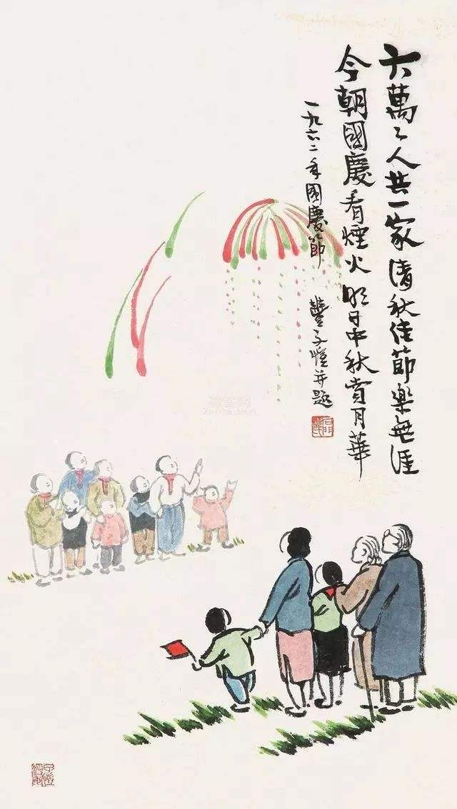 丰子恺是中国现代画家、散文家、美术教育家、音乐教育家、漫画家、书法家 和翻译家。他曾以“国庆”为主题进行多幅漫画创作,如《庆祝国庆》、《国庆十周年》、《欢度国庆》、《庆贺国庆》、《国庆烟火》等。