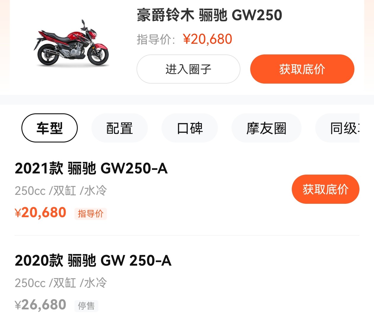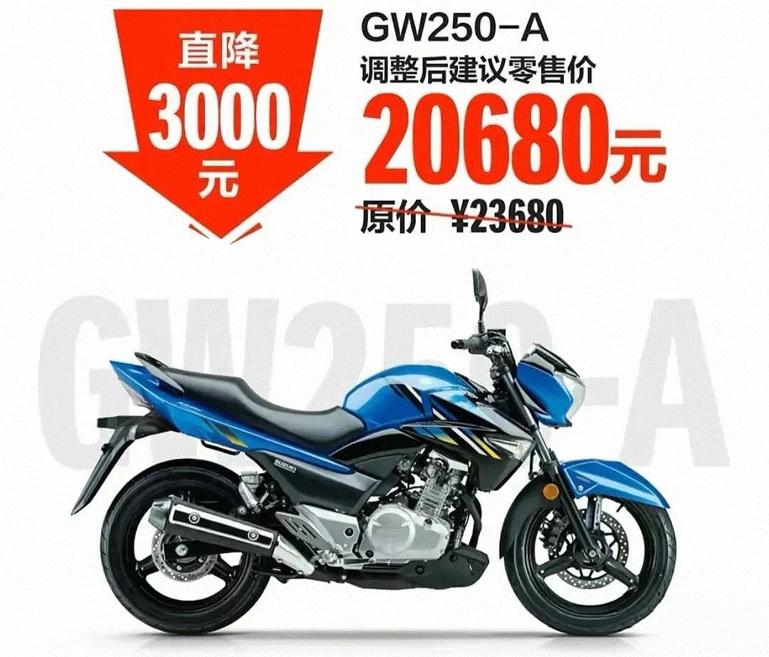 铃木GW250最巅峰的时候裸车报价26680元,后续调价至23680元成家也是不死心,现在也是处于停产的边缘新车报价20680元,但是这还不是真正的底价!