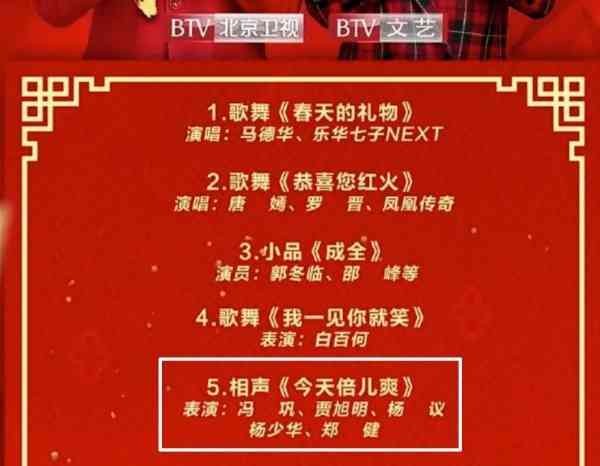 此外,据@北京电视台 官方微博消息,在提前录制好的北京台春晚上,冯巩还将带来相声《今天倍儿爽》。