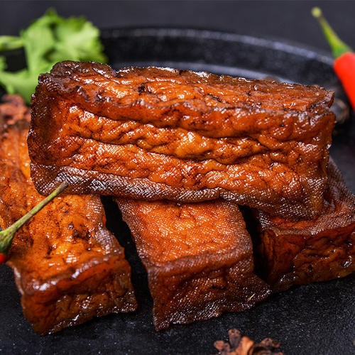 武冈卤豆腐是富有浓郁地方特色的传统卤制产品,它选用武冈特有的优质豆腐为主要原料,加入以大茴、小茴、桂皮等二十几味地道中草药制作的卤汁,经过卤制、高温杀菌、保温培养、分级等工艺流程制作而成。
