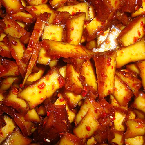 武冈卤豆腐食用起来也非常方便,你可以直接加上辣油、葱花、辣酱等配料直接食用。一口下去,辣油从嘴角流下;随着咀嚼,豆腐、辣油、葱花、辣酱在口腔内形成一个循环,刺激者舌苔和味觉神经。得到充分的咀嚼,卤豆腐随着食道来到胃里;这时一股暖流流过,忍不住去吃下一口。