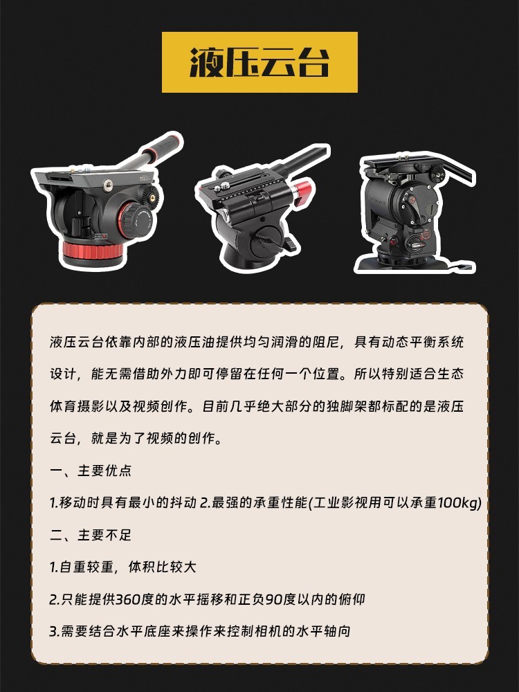 3.液压云台:液压云台依靠内部的液压油提供均匀润滑的阻尼,具有动态平衡系统设计,能无需借助外力即可停留在任何一个位置。所以特别适合生态体育摄影以及视频创作。目前几乎绝大部分的独脚架都标配的是液压云台,就是为了视频的创作,承重能力很好,就是比较笨重。