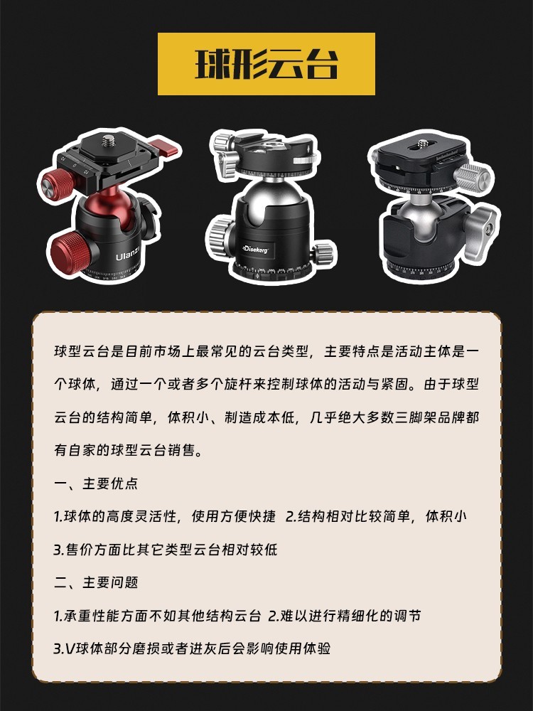 1.球形云台:最常见的云台类型,主要活动主体是一个球体,可以通过一个或者多个旋杆来控制球体的活动与紧固,由于球形云台的结构简单,好操作,所以摄影新手一般都是从这款开始上手的,价格也相对来说较为便宜。