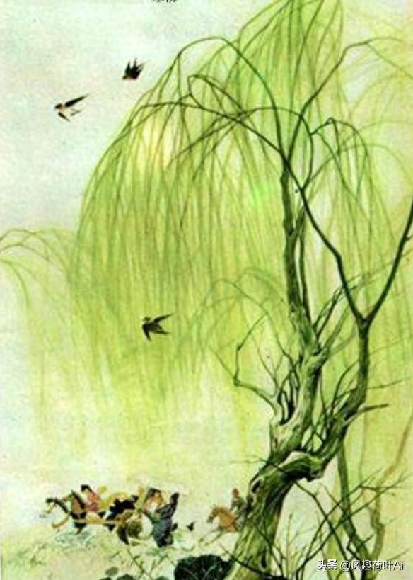 柳树像碧玉装扮成的美女一样,千万枝柳条像她那绿色的丝带。知道这细嫩的柳叶是谁剪裁的吗?就是那像剪刀的二月春风啊!