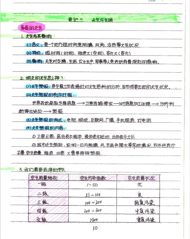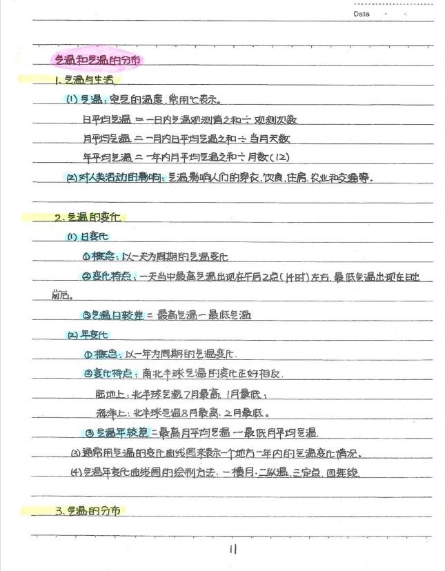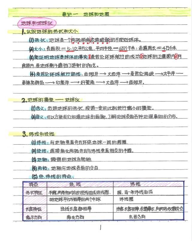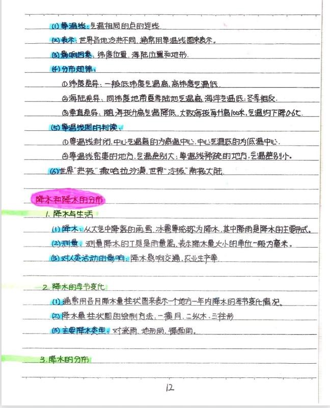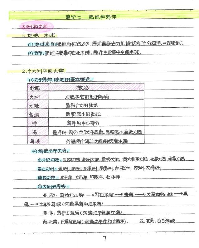 其实要想学好地理并不难。要重视地理概念的学习,要对所有的地理概念一一消化、理解、吸收,不留夹生饭。同时学会理解各种地图、景观图、示意图、结构图、统计图等等。只有概念清楚了,判断、推理问题才能正确无误。家长也要引导孩子养成勤做笔记的习惯,下面的笔记是我的一位学生的手写笔记,突出重点,脉络清晰,书写精美,堪比课本。
