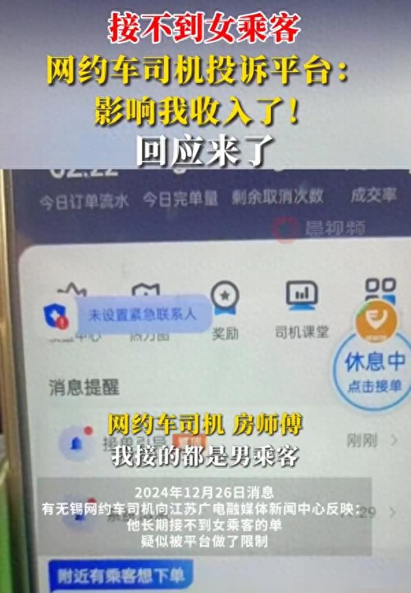无锡一位网约车司机房师傅连续好几个月没有接到女乘客的单子了,这让他感觉很不对劲,于是把平台给投诉了。因为他认为,这已经影响到自己的收入了。