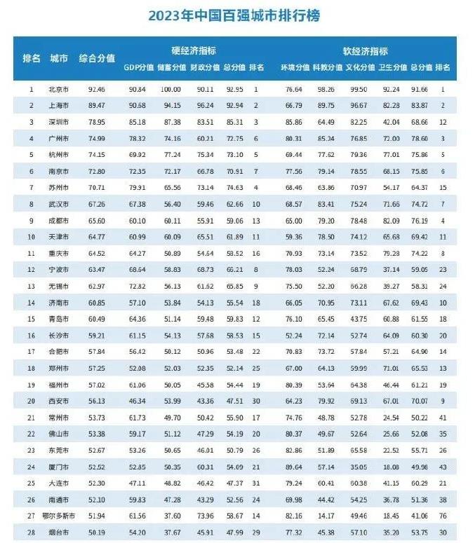 中国百强城市排行榜:北京、上海、深圳稳居前三,宁波超越无锡位列第十一