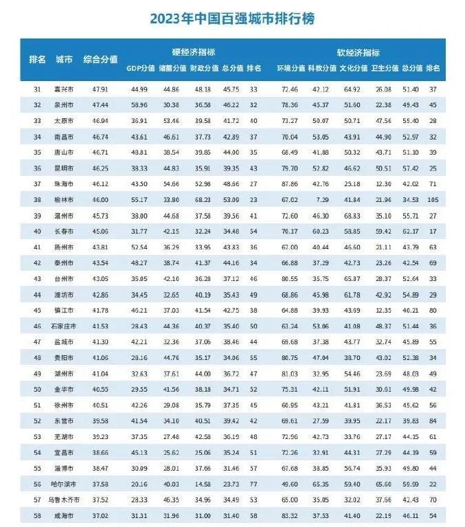 不过,与去年相比,宁波上升了一位,超过了无锡;青岛也上升了一位,超过了长沙;合肥同样上升了一位,超过了郑州。
