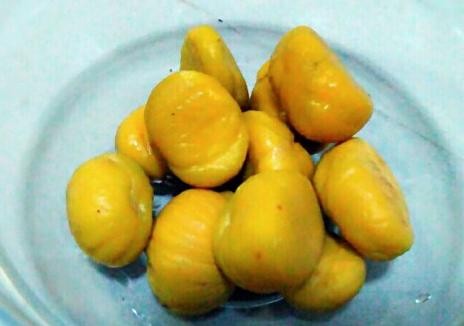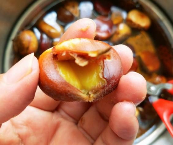然后我们来处理食材:板栗我们要选择一下,有虫眼的板栗我们可以挑出来,洗净后放置备用,锅中放入适量的清水,加入少许食用盐,水开后放入新鲜板栗,盖上锅盖,焖5分钟,然后就可以把板栗和热水一起倒在容器中,用剪刀在板栗上面剪开一个口子,然后趁热给板栗剥皮,这样不伤指甲就能轻松搞定了,就连里面的棕色外衣也能轻松去掉,剥出来的板栗干净又完整是不是很完美?