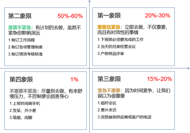 工具1、四象限分类法:如果一个管理者把时间都用来救火上,也就是第一象限,那他就会有救不完的火,减少救火的最好办法就是多做第二象限的事,尽量数字资源不要去做第四象限的事情,有些理工管理人员看看手机,上上网,例行过程一下公事一天就混过去了。