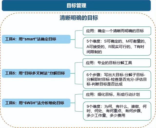 第二、目标管理:衡量一个岗位的价值就是看他在有限时间内产出了多少结果,这些结果对企业的价值有多大;管理者就是要在好用有限的时间内高效地完成企业制订素材的目标,要想高效的完成目标,给大家介绍以下3个工具
