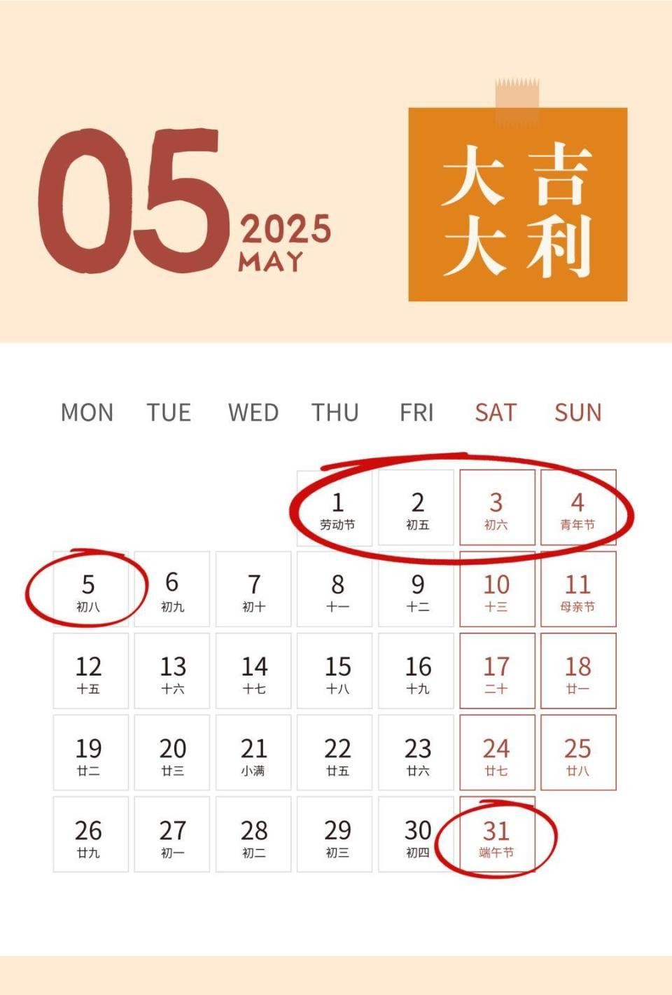 5月1日—5月5日,劳动节放假,共5天。