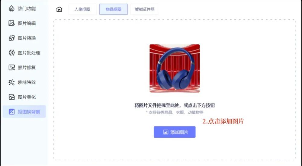 第一步:打开软件,选择抠图换背景中的物品抠图。
