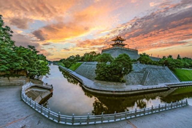 西安城墙建于明朝,全长约14公里,高约12米。城墙由灰砖砌成,坚固耐用,里面嵌有垮箭楼、哨楼、烽火台等防御设施。城墙周围环绕着护城河,形成了双重保护。城墙上建有城门和角楼,以方便进出和观望。登上城墙,可以俯瞰整个城市的美丽景色,感受到历史的厚重和文化的瑰宝。