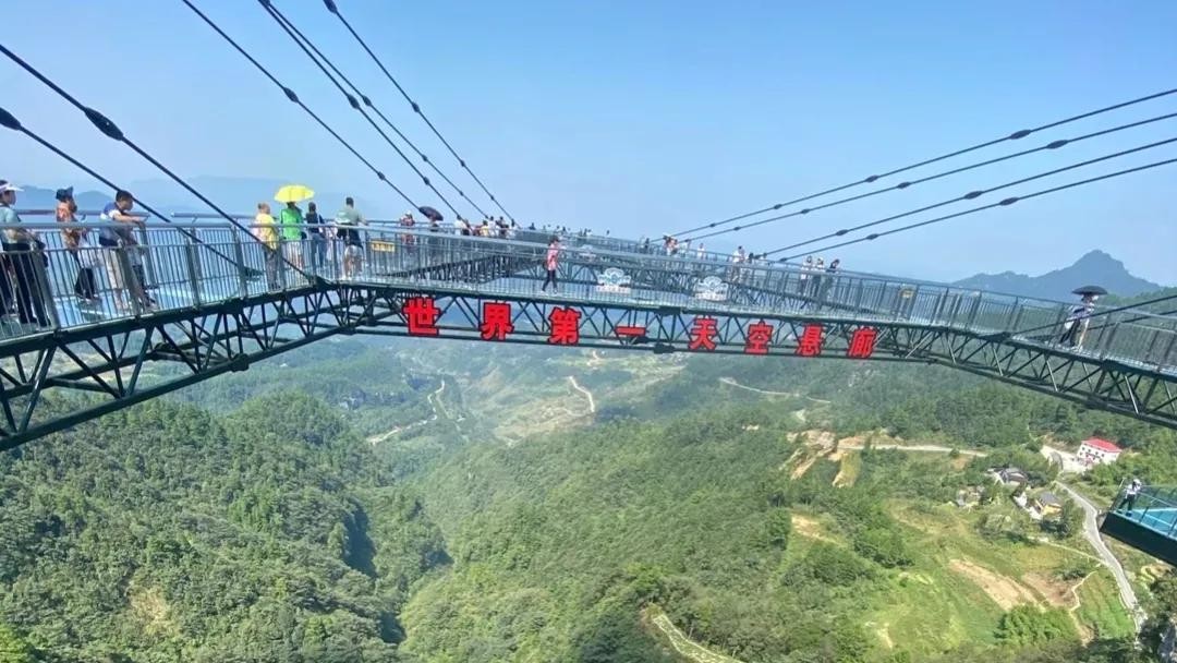 景区最出名的就是天空悬廊,离地面有300米呈A字形,整体向悬崖外探出的长度是69米。整个桥面是全透明的玻璃,并且申请了吉尼斯世界纪录,不但感受在上面的刺激还能看到天空和四周美丽的风景,在最前端摆上好的姿势拍一组美美的照片。