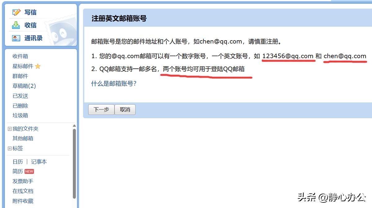在打开的【注册英文邮箱账号】界面,可以看到说明信息,QQ邮箱可以同时有2个账号,一个数字账号,对应邮箱为QQ号码加@qq.com;另一个是英文账号,对应邮箱为英文账号名加@qq.com。两个账号均可用于登陆QQ邮箱。