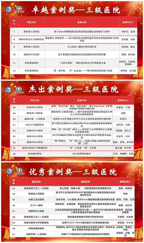 整形美容外科参赛案例《运用FOCUS-PDCA模式提升门诊患者就医体验》展示了陕中附院深化人文关怀服务,提升门诊护理质量的创新实践,荣获大赛“优秀案例奖”。