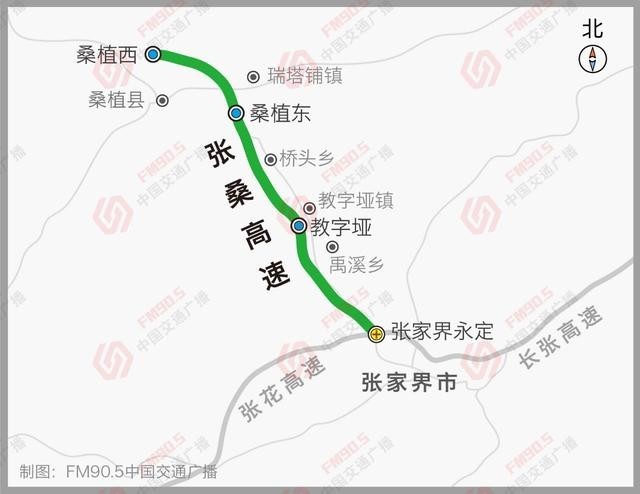 张桑高速公路起于桑植县,终点在张家界市西的蒋家庄,主线全长46.95公里,连接线18.275公里,设计速度为80公里/小时。公路的正式开通,对改善湘西北地区交通运输条件,加速湖南与贵州、重庆、湖北三地的高速路网对接有重要意义。