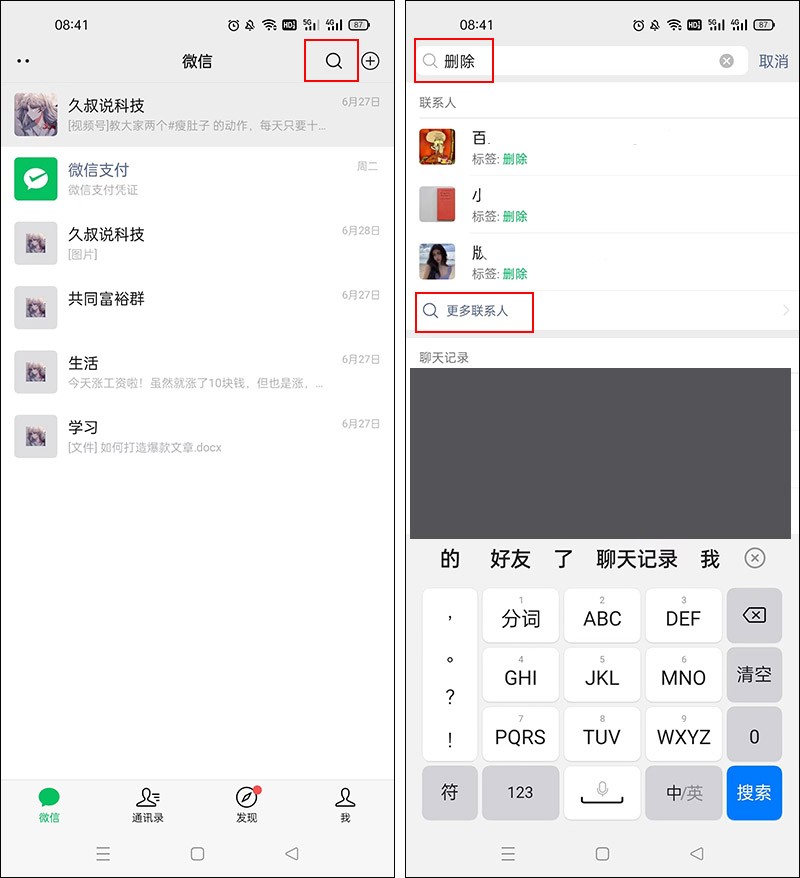 回到微信首页,点右上角的放大镜,输入【删除】,点【更多联系人】;