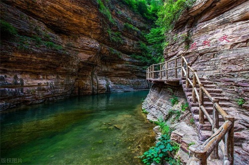 6、龙潭大峡谷景区:位于新安县,是紫红色石英砂岩经过长时间冲刷形成U型峡谷的代表。