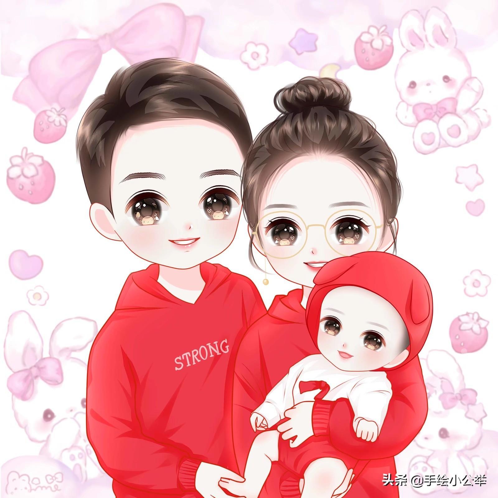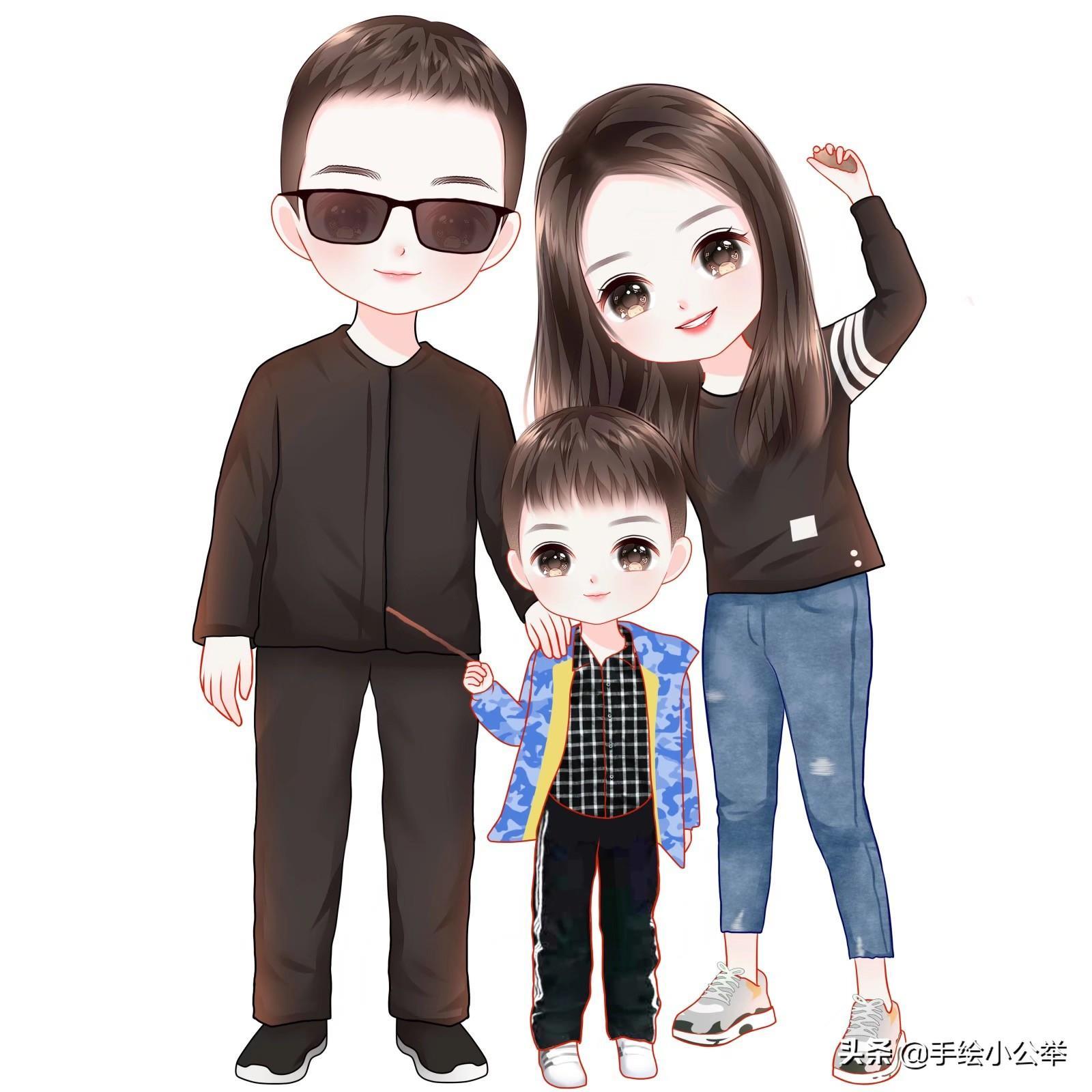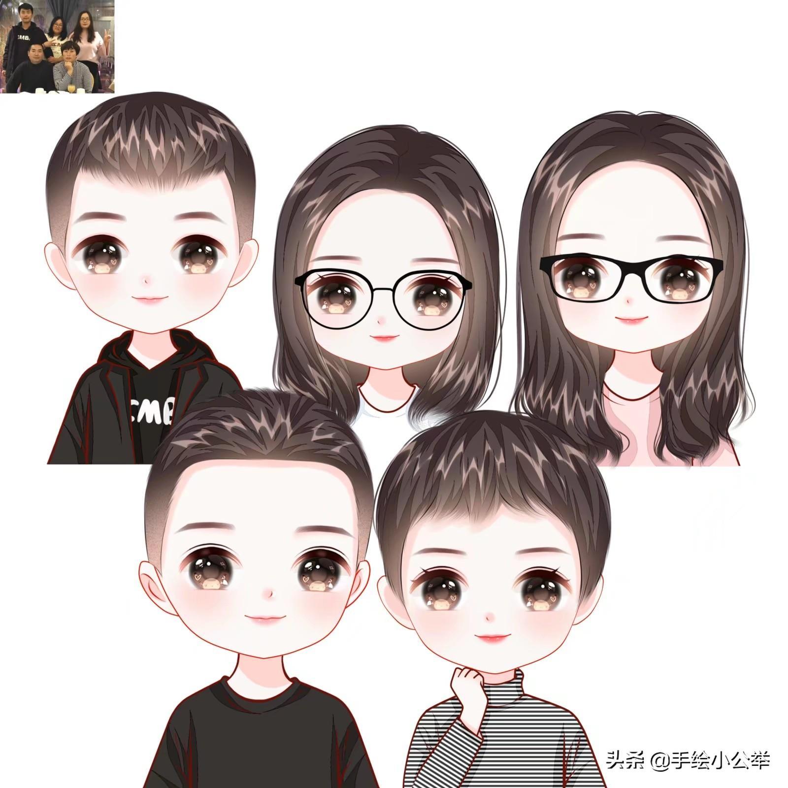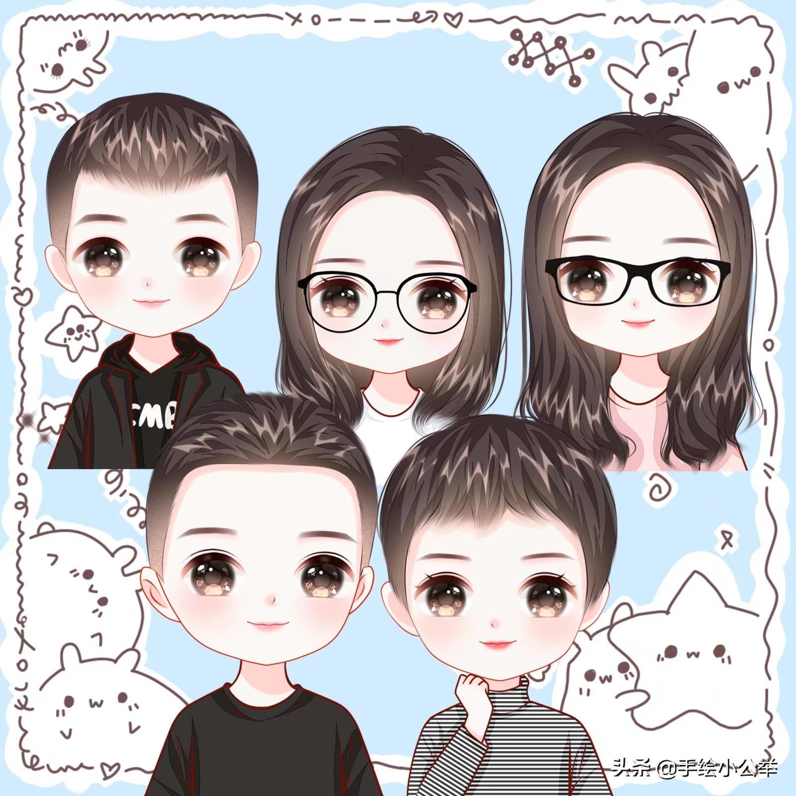 一家四口五口卡通真人手绘全家福,可爱呆萌,有趣有意思..