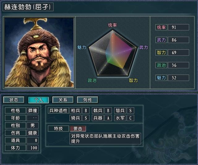 赫连勃勃应该是这些容易叛变的武将中玩家们最喜爱和最讨厌的了。喜爱是因为赫连勃勃拥有91的统率值和弩兵、骑兵两个S适性,是一名作战非常强的武将,容易叛变的他也是经常能被玩家所登用,这对于玩家操控一些小势力的时候来说可是一大战力;讨厌是因为在登用赫连勃勃后如果他是主将且部队没有被消灭,那么很可能都没有机会回来就被其他势力给截胡了。