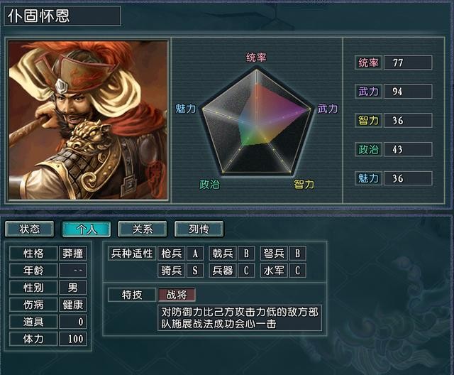作为李唐的在野人才,只要是李唐周围的势力都会去把他偷来。仆固怀恩的历史形象也是导致了他在游戏中是一个非常容易叛变的武将,尤其是李唐的其他优质武将给他做副将的时候往往仆固怀恩叛变了还把副将中优秀的人才一并拐跑了,真是赔了夫人又折兵。