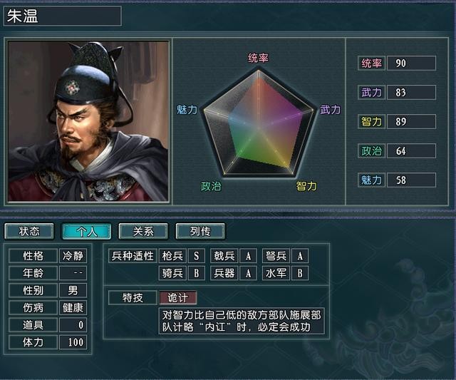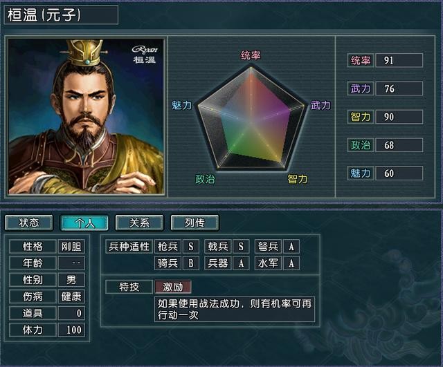 作为三大在野“忠臣”之一的桓温以其优秀的属性和特技成为各个势力向往的人才,但是最让大家喜爱桓温的原因就是他的叛变属性,只要是适性相近的君主势力在登用桓温的时候几乎都是手到擒来,前期拥有桓温的小势力在其他势力的进攻下也能从容面对。