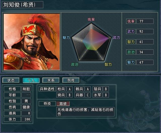 位于朱温势力的刘知俊由于君主朱温的魅力值非常低并且自身的叛变属性,往往连第一年都没完刘知俊就只有95左右的忠诚了,这个忠诚值对于一般的武将来说可能不会叛变,但是对于刘知俊来说几乎只要是军师推荐的人去登用他,他就会叛变。