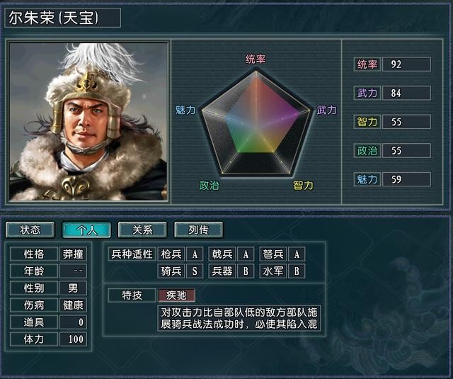 前期不俗的带队能力,后期优质的骑兵副将特技,这些让尔朱荣在各个势力之间都非常吃香。虽然拓跋珪很少搜索到尔朱荣,使得他经常漂泊在各个势力间,但是这并不影响其的叛变属性,在与君主适性相差稍大的势力中,几乎每隔一个季度就得让尔朱荣回城去褒奖他,不然的话不知道什么时候他就变成别人的武将了。