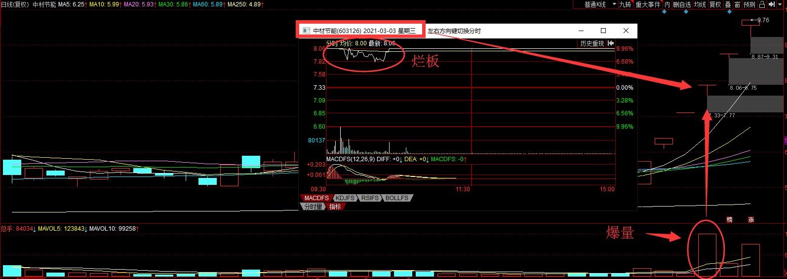 就以最近最强的中材节能为案例。中材节能作为碳中和概念的龙头股,经历一波炒作后,在第四个涨停迎来了烂板爆量,如图所示: