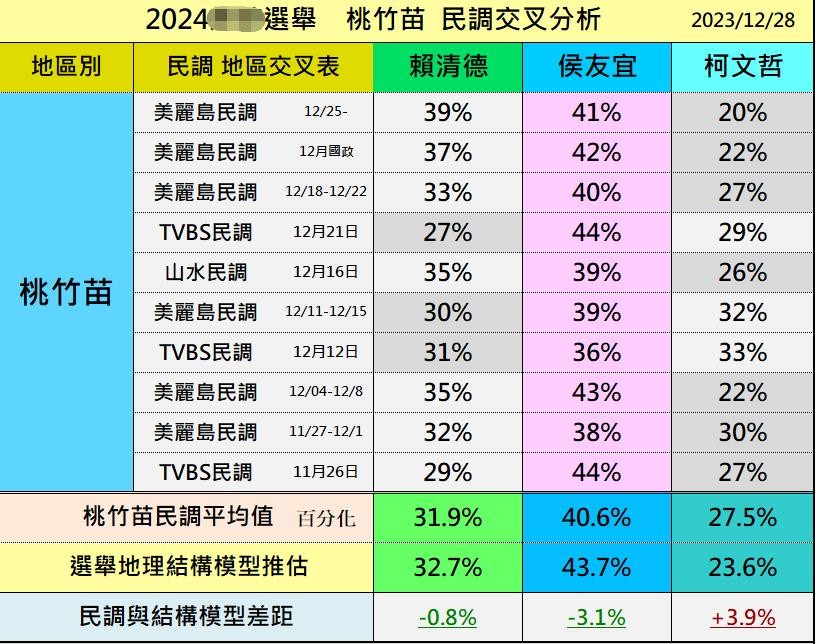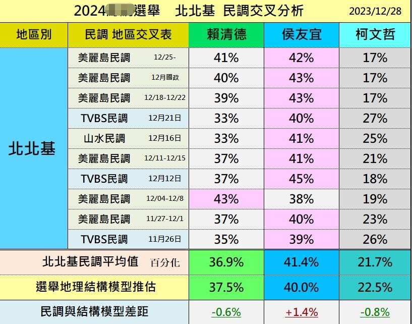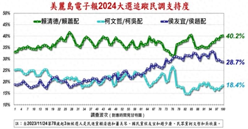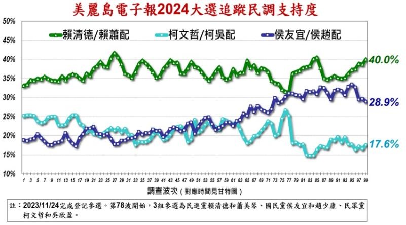 据美丽岛电子报最新的第100期民调显示,民进党「赖萧配」持续领先,与第二名的国民党「侯康配」有逐渐拉开的架势,是近期第一次看到双位数百分比的领先优势,民众党「柯盈配」继续垫底。