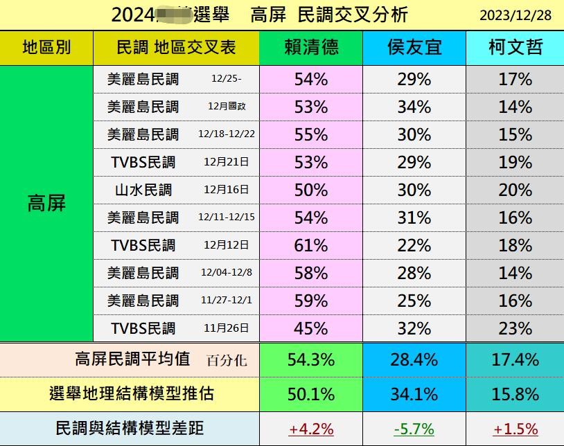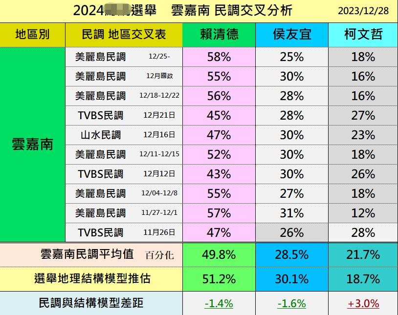 以地区来看,民进党「赖萧配」的支持度在中南部各县市皆呈现领先,特别云嘉南、高屏地区更是一马当先突破50%。国民党「侯康配」在北部地区也仅有稍稍领先优势。