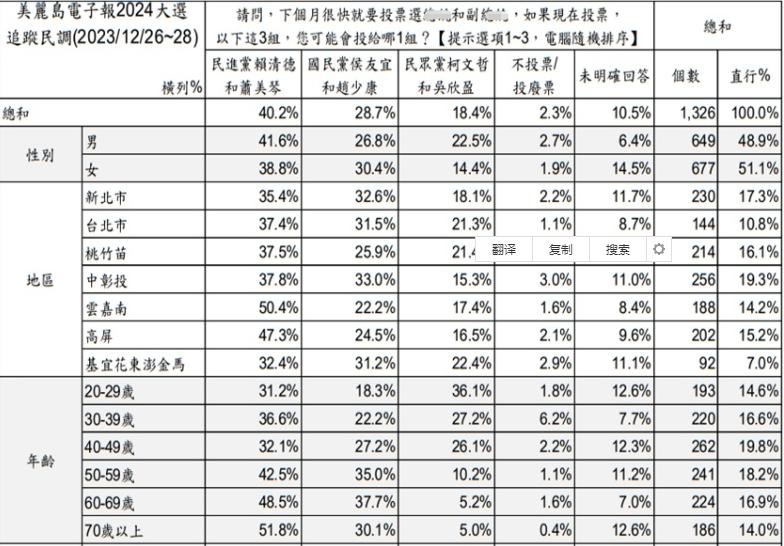 在年龄层方面,民进党「赖萧配」在多数年龄层也皆具领先优势,尤其在60岁以上老年群体中遥遥领先接近或突破50%,仅在20至29岁年龄层中,以31.2%输给民众党「柯盈配」的36.1%,充分体现出民众党「柯盈配」在年轻族群中的受欢迎程度很高。