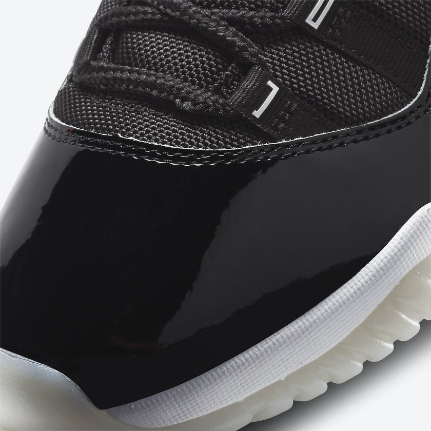 织物网布、皮革以及遵循元年的大漆皮材质塑造,尽显不凡规格。液态银色飞人 logo 以及仅在 AJ 11 “DMP” 中出现过的金属 “JORDAN” 字样鞋带孔,堪称精髓设计,让人眼前一亮。并且值得一提的是,金属是禧年周年纪念的象征。