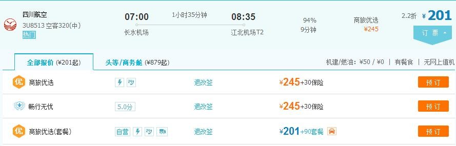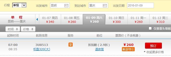 当然还有一个方面也是用户十分关心的那就是票价,笔者点击去哪儿网的网站和客户端看到,目前各航空公司旗舰店取消后,机票已经无法直接从各航空公司处购买,而只能从不同的代理商那里购买。还是以川航为例通过票价比对我们可以看到:昆明飞重庆的同一时间航班,川航官网订票价格260元但是没有任何的附加资费,而去哪儿尽管显示的价格201元更加优惠,可是进入预定页面是需要同时购买附加套餐201元+90元才可以出票的。所以,通过去哪儿购票也并没有享受到实际的优惠,反而选择官网直接购买才是底价的优惠并且还可以享受优质的服务。