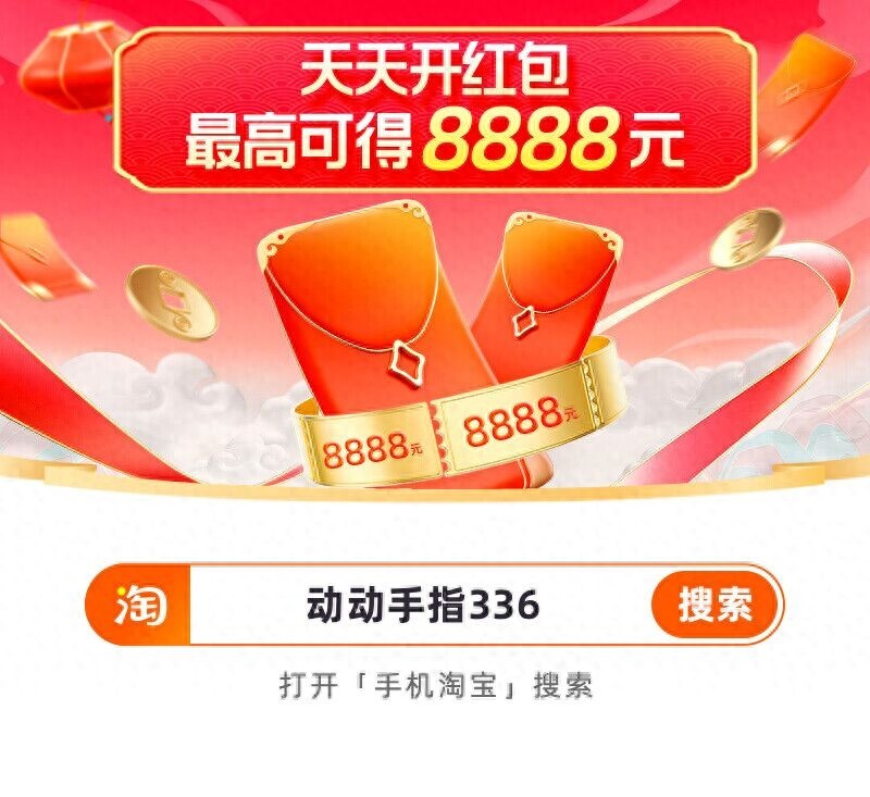 2024天猫淘宝最新年货节超级红包口令是【动动手指336】,只需要复制该口令后打开手机淘宝APP,在搜索框内输入红包口令【动动手指336】,点击下搜索即可到达2024年货节8888元超级红包会场!