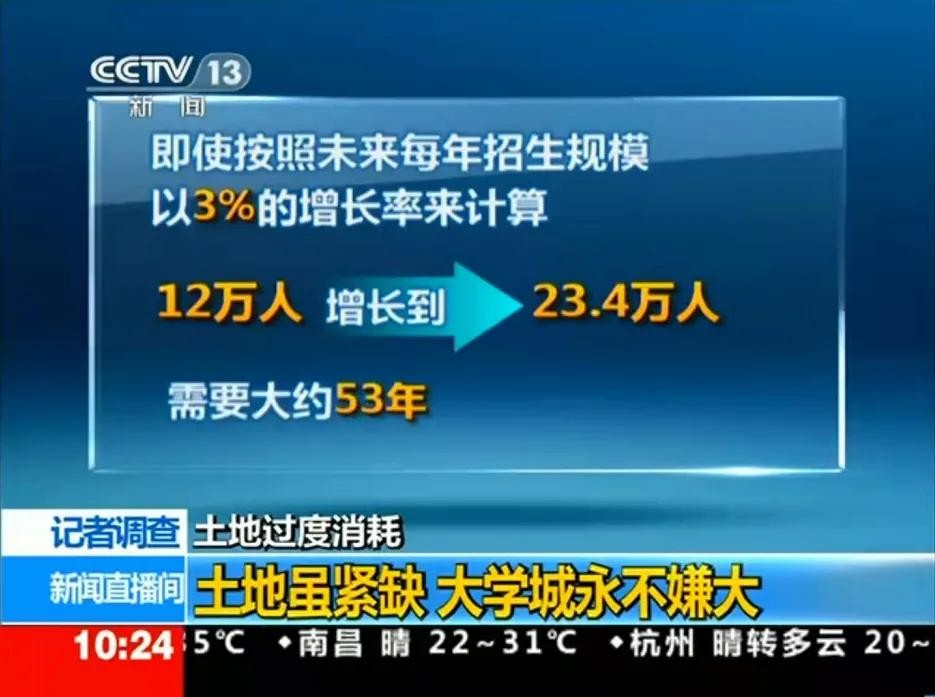 报道进行数据推算,11.7平方公里的规划用地面积,可容纳师生23.4万人,按照当时的招生规模增长率,将有近一半的土地在53年内得不到充分利用。