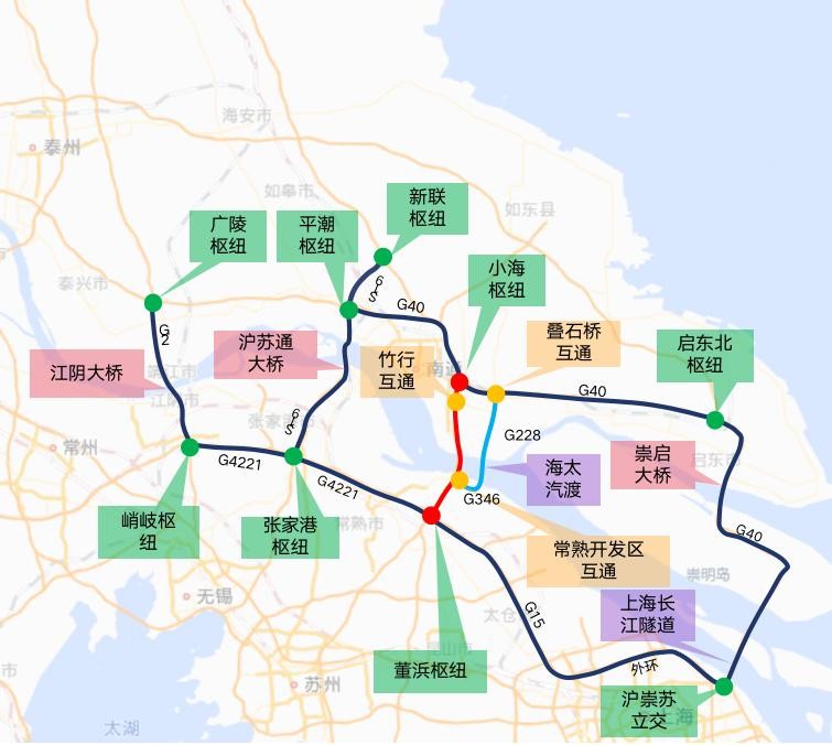 2、由上海前往连云港、盐城、山东或海安、如皋、如东等方向的车辆,从张家港枢纽由沪苏通大桥过江,绕行S19锡通高速,或由崇启大桥过江,绕行S28启扬高速;