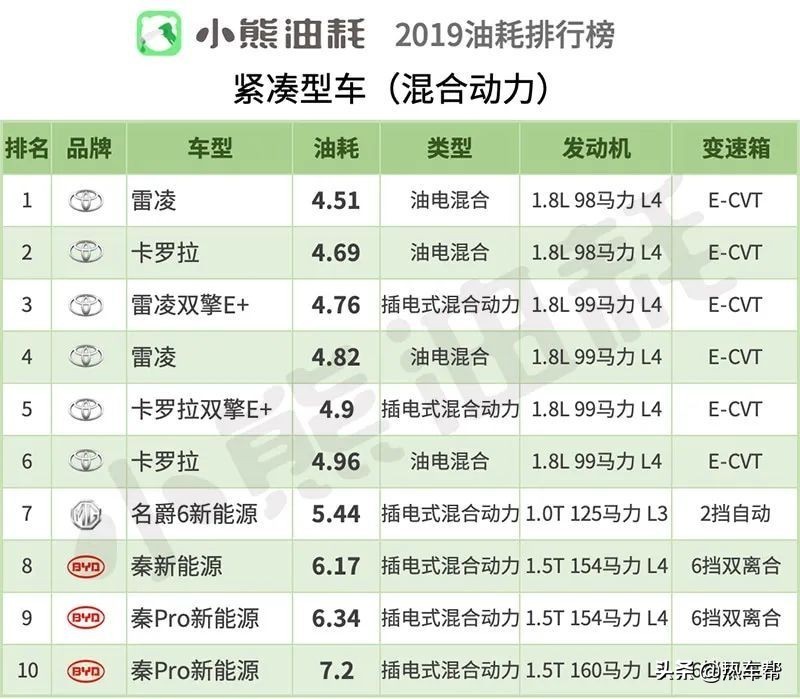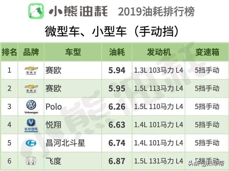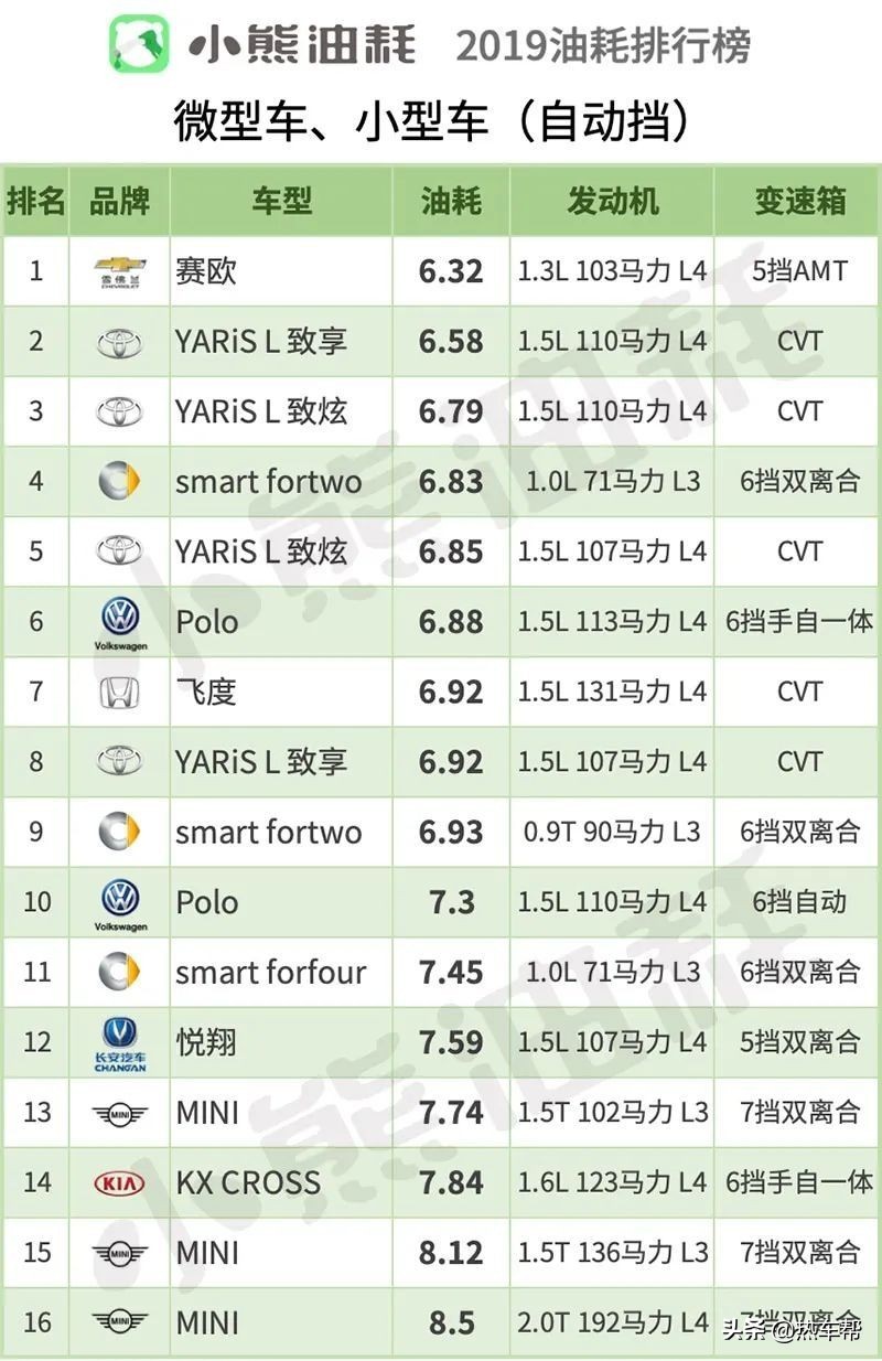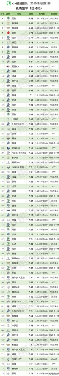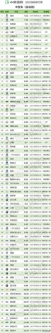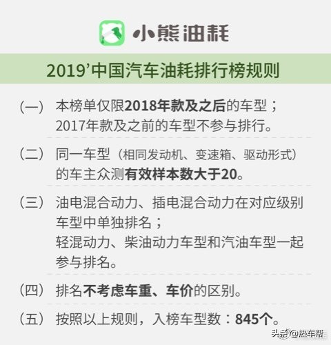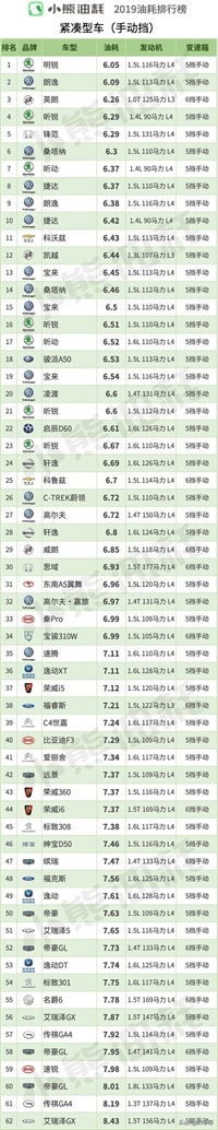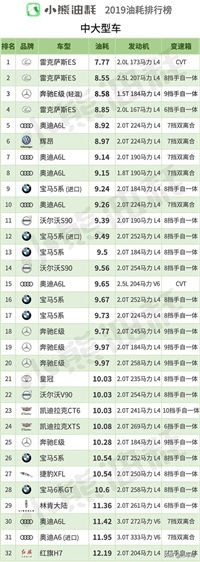 2019’中国汽车油耗排行榜基于小熊油耗真实车主用户提交的加油记录统计制作。排行榜制作过程采用严谨的统计方法,如实反映各款车型在车主实际使用中所体现出的油耗性能。